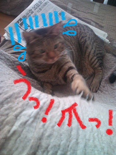 爪がソファーカバーに引っかかってます。