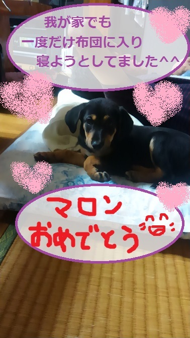 マロン君、我が家でも一度パパさんの布団で少し寝ちゃったことがありました。