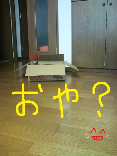 逃げ込んだ先は食器棚の上の箱の上。